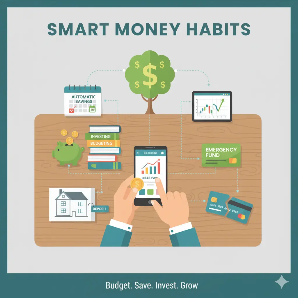 Some common smart money habits include creating a budget and tracking expenses, building an emergency fund and paying off debt, investing for the future and retirement, and managing risk and avoiding financial pitfalls.